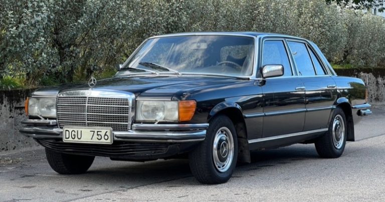 S-класс первого поколения (W116) синего цвета с немудреной обивкой с тканевыми вставками на сиденьях был приобретен для королевского гаража вместе с еще несколькими такими же автомобилями в 1973 году. Это был год, когда нынешний король Карл XVI Густав взошел на престол после кончины своего деда Густава VI Адольфа.