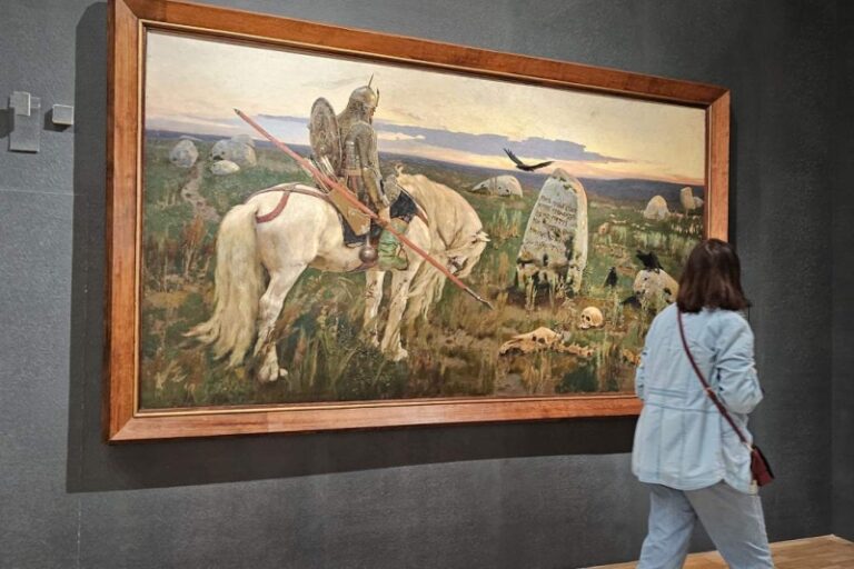 «Иван Царевич на сером волке», «Ковер-самолет», «Витязь на распутье» и, конечно, «Богатыри». Именно эти картины всплывают в памяти любого человека, как только речь заходит о Викторе Васнецове. С ними же в первую очередь встречается посетитель крупной ретроспективы «Васнецовы. Связь поколений. Из XIX в XXI век», открывшейся в Новой Третьяковке. Но не менее важную часть экспозиции составляют работы брата Виктора — пейзажиста Аполлинария — и внука Андрея, представителя советского «сурового стиля». В итоге получилась не просто панорама творчества классика, но путешествие по эпохам и зримая связь поколений. «Известия» в числе первых приобщились к прекрасному.